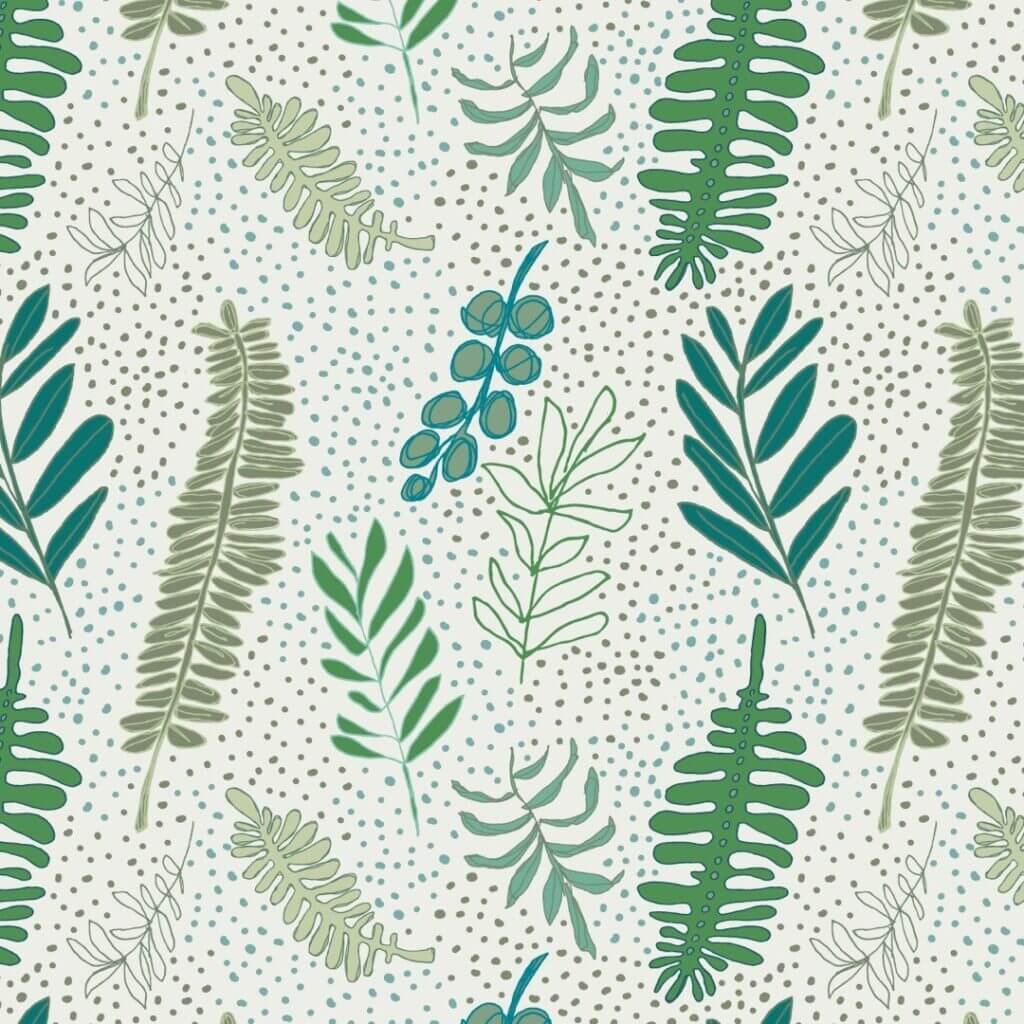 I love the color palette and like the random dots surround the ferns and leaves.